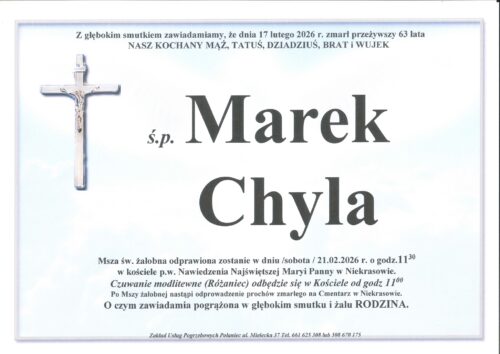 Pogrzeb odbędzie się w dniu 21.02.2026 r/sobota/ o godz. 11:30 w kościele p.w. Nawiedzenia Najświętszej Maryi Panny w Niekrasowie.